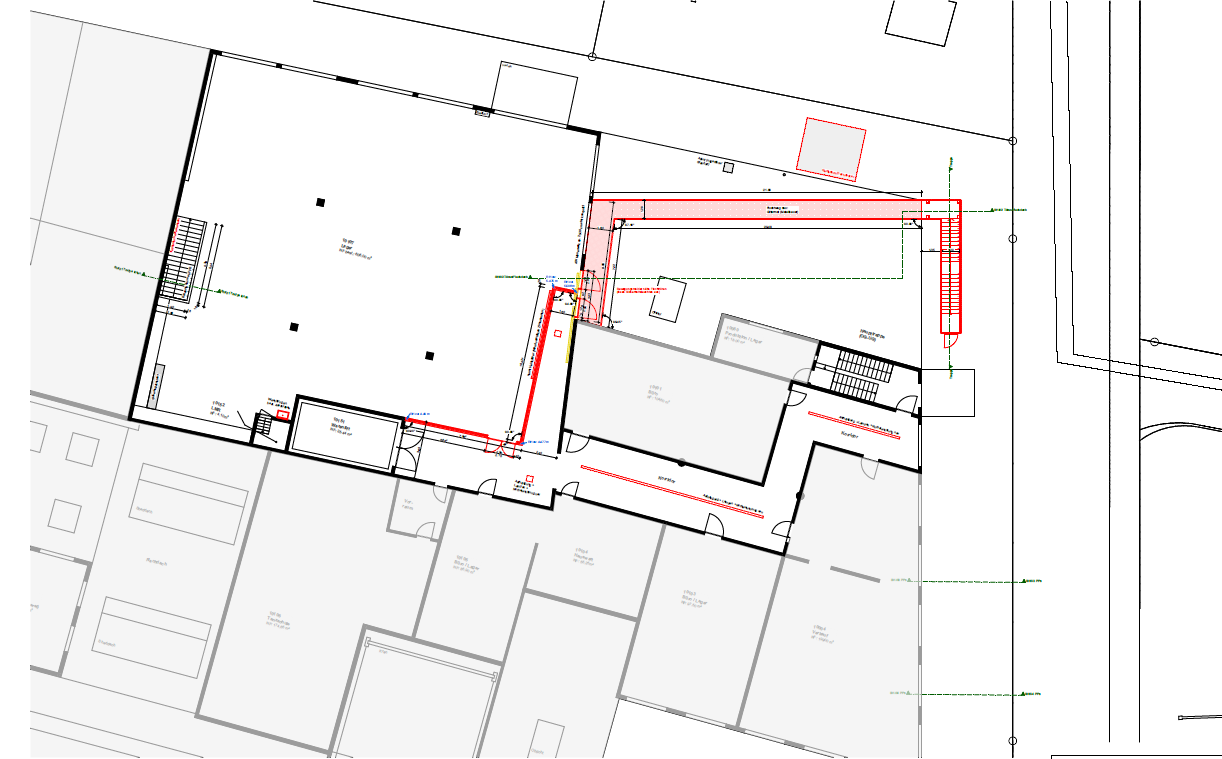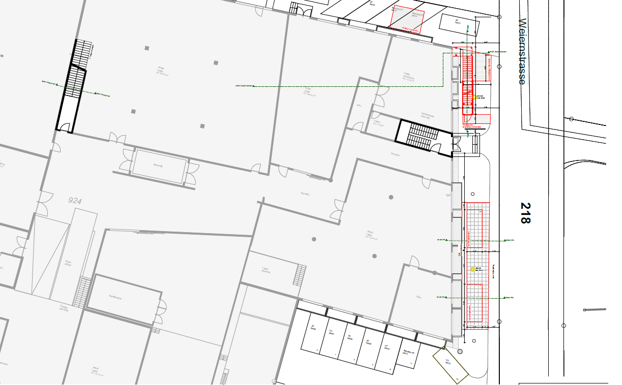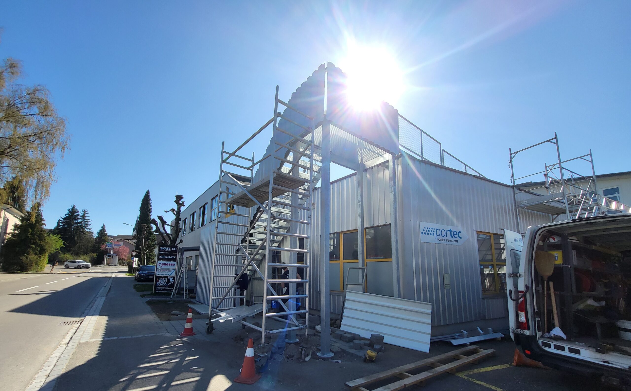 Im Aussenbereich entstehen zusätzliche Parkplätze. Zudem wird ein neuer Fluchtweg realisiert: Mit Hilfe einer Treppe führt dieser vom 1. Obergeschoss über das Flachdach sicher in den Aussenbereich des Erdgeschosses.